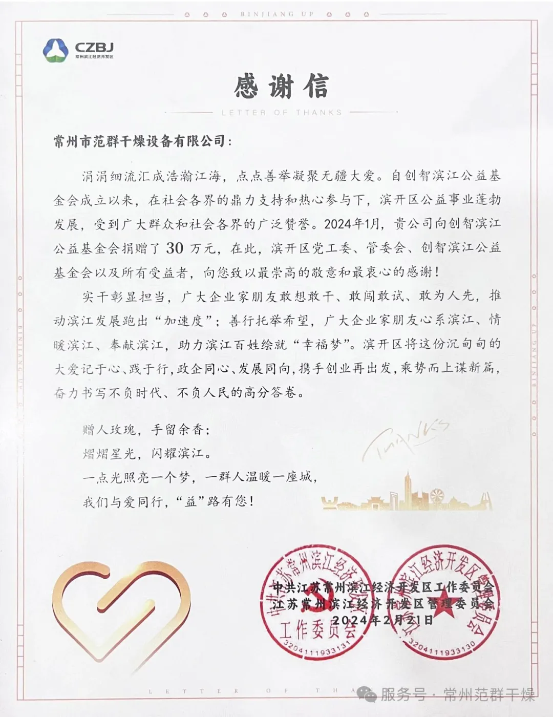 近日,常州市范群干燥設備有限公司向創(chuàng)智濱江公益基金會捐贈30萬元,以實際行動支持濱開區(qū)公益事業(yè)發(fā)展,用愛心善舉踐行企業(yè)社會責任,為區(qū)域公益事業(yè)注入溫暖力量。